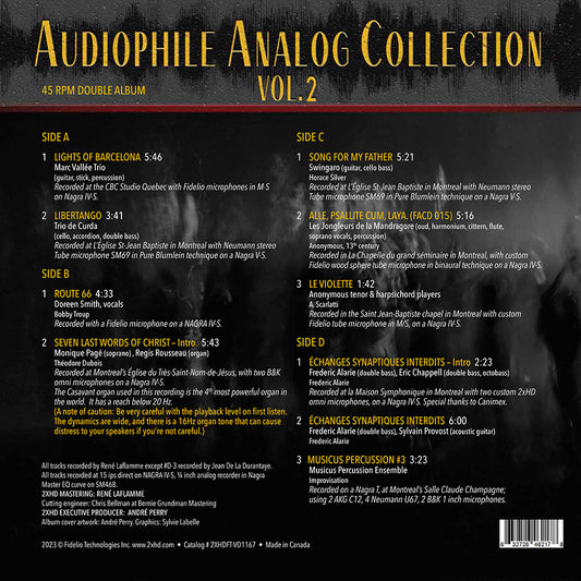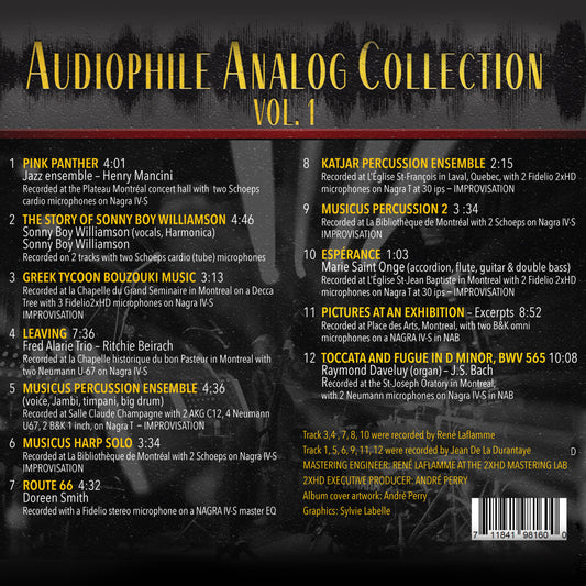 Audiophile Analog Recordings Volume 1 is a special gathering of Analog Audiophile two Microphone Recordings at their best. The tracks on the album feature a variety of musical genres including Jazz, Blues, Movies, Percussion Ensemble, Vocals, Soloists, World Music, and Classical Music.
