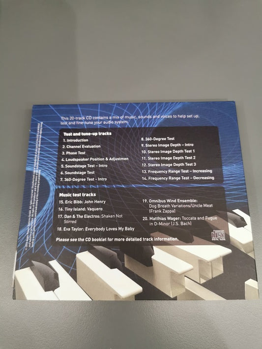 20 tracce per aiutare a configurare, testare e mettere a punto il sistema audio. Il CD è composto da un mix di musica, suoni e voci, che incorpora 14 brani specifici di test e messa a punto insieme a musica accuratamente selezionata dalla rinomata etichetta musicale Opus3.Valutazione del canale.Test di...