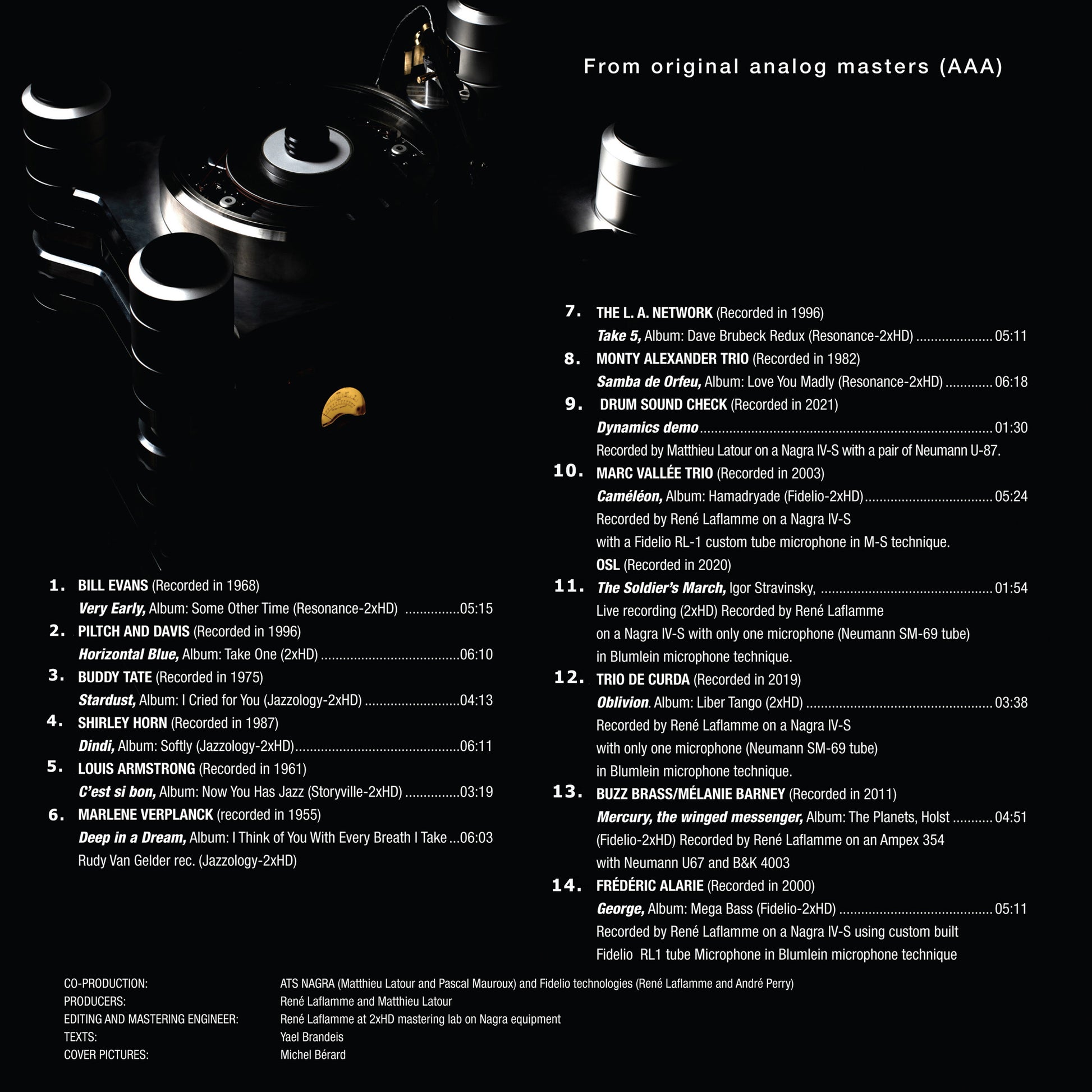 Mastered at 2xHD on Nagra equipment, the set is pure analog from analog master tapes. It includes tracks from Bill Evans, Louis Armstrong, Monty Alexander and Buddy Tate and other amazing audiophile tracks that were recorded on the legendary Nagra IV-S tape recorder.