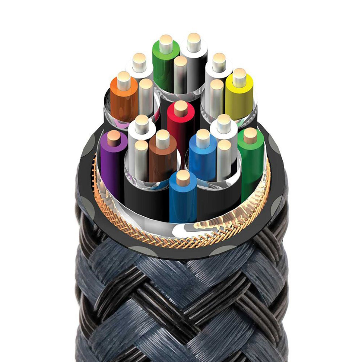 L'isolamento in schiuma rigida (HCF) assicura una geometria della coppia di segnali critica. Qualsiasi materiale solido adiacente a un conduttore è in realtà parte di un circuito imperfetto. I materiali di isolamento dei cavi e dei circuiti stampati assorbono tutti energia. Parte di questa energia viene immagazzinata e quindi rilasciata come distorsione. L'isolamento in schiuma a celle rigide è simile al PE espanso utilizzato nei nostri cavi Bridges & Falls più economici, ed è iniettato con azoto per creare sacche d'aria. Poiché l'azoto (come l'aria) non assorbe energia e quindi non rilascia energia da o nel conduttore, la distorsione viene ridotta. Inoltre, la rigidità del materiale consente ai conduttori del cavo di mantenere una relazione stabile lungo l'intera lunghezza del cavo, producendo un carattere di impedenza stabile e riducendo ulteriormente la distorsione.