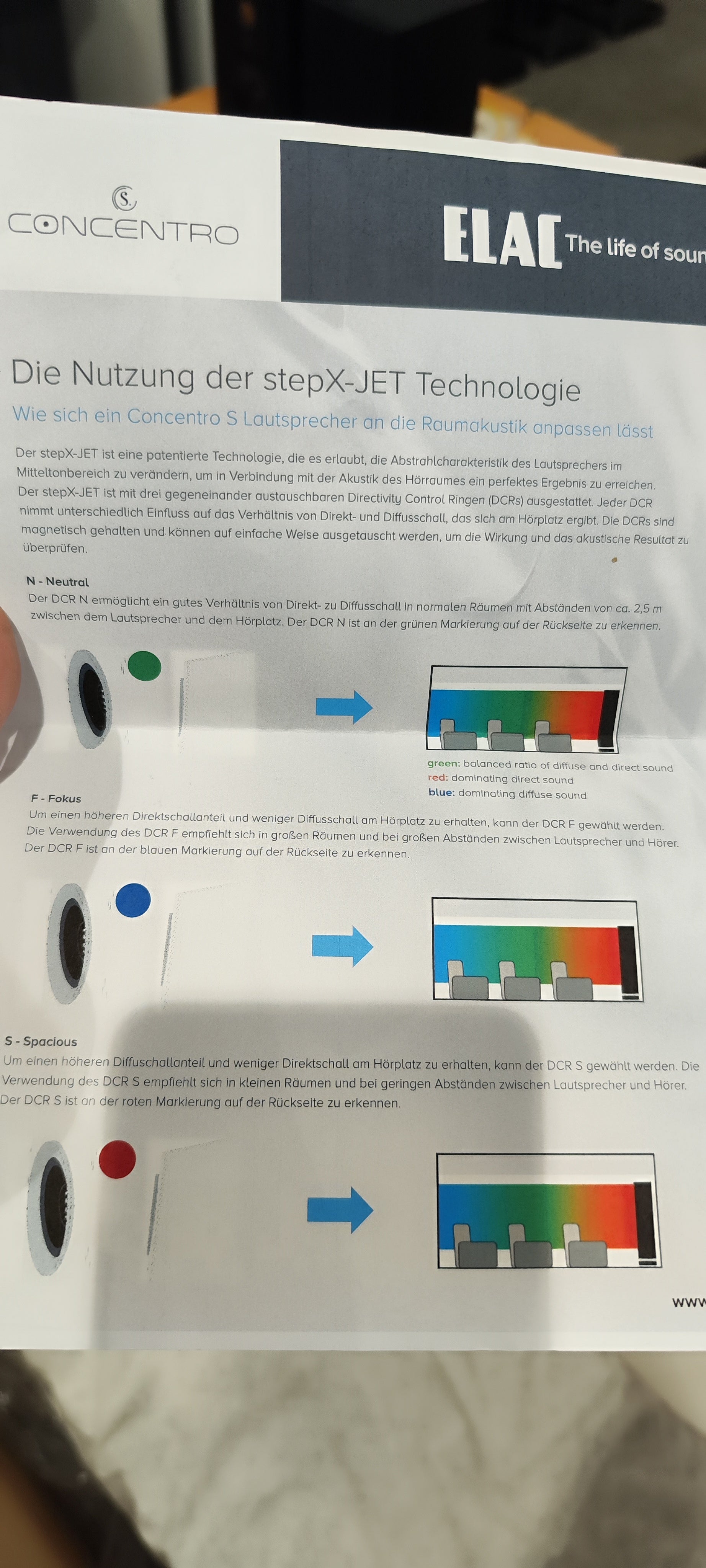 L'innovativo step X-JET è caratterizzato da un telaio concentrico costruito intorno ad un nuovo tweeter JET 6c e da un midrange con membrana in alluminio. La tecnologia brevettata utilizza DCR (Directivity Control Ring) intercambiabili per adattare le caratteristiche direzionali nella gamma delle medie frequenze alle condizioni dell'area di ascolto. I diversi DCR (tre DCR in alluminio sono inclusi come standard) sono utilizzati per influenzare il rapporto tra suono diretto e diffuso nell'area di ascolto. Quattro potenti woofer a lunga escursione laterale garantiscono prestazioni senza sforzo. La speciale configurazione ICD (Impluse Compensated Design) garantisce una riproduzione dei bassi sagomata e priva di qualsiasi colorazione dovuta a vibrazioni meccaniche indesiderate. In parole povere, il Concentro S 507.2 soddisferà gli ascoltatori più esigenti riproducendo i segnali audio alla perfezione su tutto lo spettro delle frequenze e a tutti i volumi.