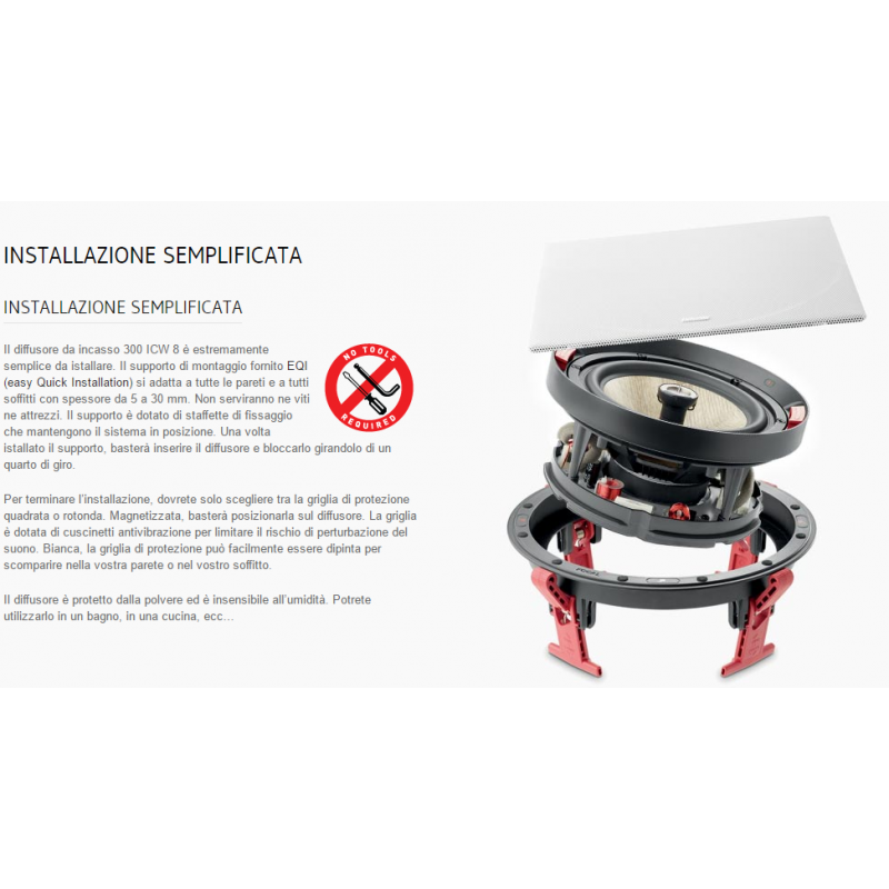Il diffusore da incasso 300 ICW 8 è estremamente semplice da istallare. Il supporto di montaggio fornito EQI (easy Quick Installation) si adatta a tutte le pareti e a tutti soffitti con spessore da 5 a 30 mm. Non serviranno ne viti ne attrezzi. Il supporto è dotato di staffette di fissaggio che mantengono il sistema in posizione. Una volta istallato il supporto, basterà inserire il diffusore e bloccarlo girandolo di un quarto di giro.