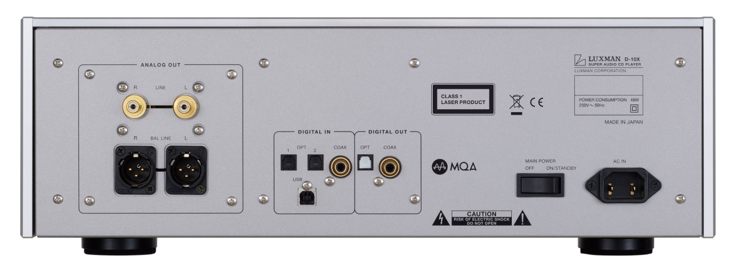 Lettore CD e SACD stereo con decodifica MQA, nuovi convertitori RHOM BD3430EKV, nuova meccanica di lettura LxTDM-i, nuovo circuito analogico bilanciato ODNF-u, ingresso USB per files HiRes PCM fino a 768kHz/32bit, DSD fino a 22.1 MHz, uscita analogica bilanciata XLR e RCA, 2 ingressi digitale ottici, ingresso digitale coassiale e digitale ottico, dimensioni (WxHxD) 440x154x418mm, peso 22,4 kg. Finitura Silver