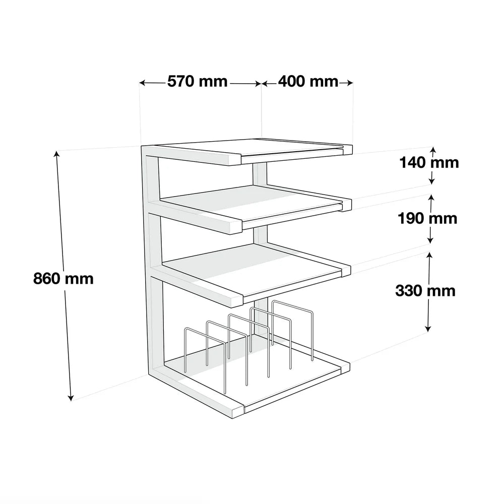 Il ripiano superiore, che grazie alla rigidità della struttura supporta fino a 40 Kg, è della misura ideale per ospitare un giradischi. Le altre elettroniche possono trovare spazio nei ripiani sottostanti.