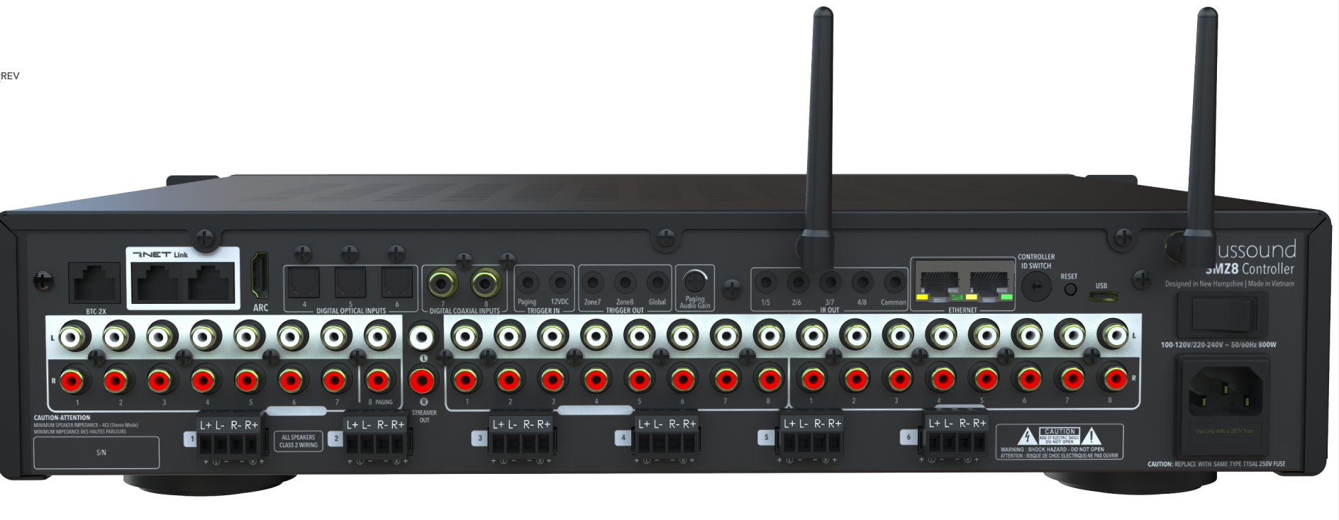 SMZ8 - 8 Sorgenti, 8 Zone, HDMI, DSP, Wi-Fi, Bluetooth SMZ8 amplificatore controller a 8 sorgenti e 8 zone con streaming integrato. Piattaforma di streaming proprietaria, Streamer audio ad alta risoluzione integrato con tutte le fonti più diffuse e supporto per AirPlay e Google Cast. 6 zone amplificate da 50 watt per canale su 8 ohm, 100 watt per canale su 4 ohm; Supporto stereo/mono; Ingresso HDMI (ARC) per la connessione ad un TV; Supporto audio Wi-Fi e Bluetooth integrato; DSP integrato: equalizzatore parametrico a 7 bande con preset integrati per altoparlanti Russound. Controllabile con XTS7, IPK-1 e app Russound; Espandibile fino a 48 zone, Montaggio a rack con alette incluse - Connettività di rete: cablata/Wi-Fi 802.11ac. Connettori di ingresso audio: fino a 8 stereo analogici, 3 digitali ottici, 2 digitali coassiali, 1 HDMI, 1 USB. 8 Uscite Pre-Out. Dimensioni: 43.4x13.4x40.2 cm (LxHxP). Peso: 8.35 kg