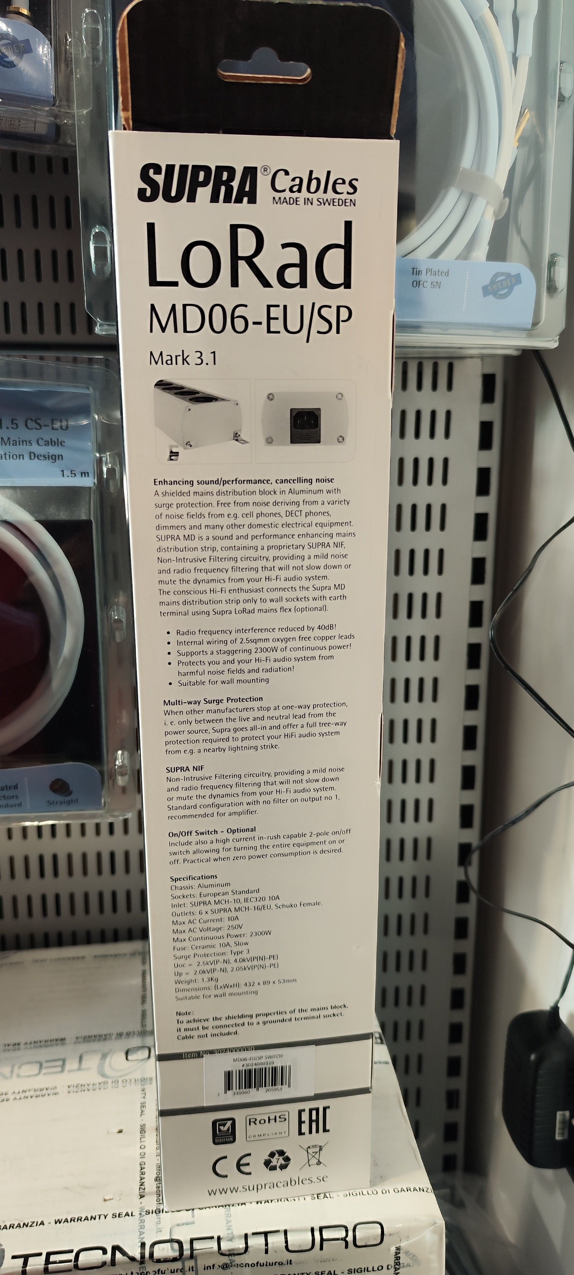 I distributori Supra sono totalmente schermati da campi elettrici grazie al loro chassis in alluminio. Lo chassis conduttivo scarica l'interferenza a terra. Deve essere connesso ad una presa dotata di messa a terra con un cavo di rete anch'esso dotato di messa a terra, per permettere di lavorare in modo appropriato. Per un grado soddisfacente di schermatura ed immunità, il distributore di rete dovrebbe essere abbinato ed usato con cavi di rete schermati SUPRA LoRad.